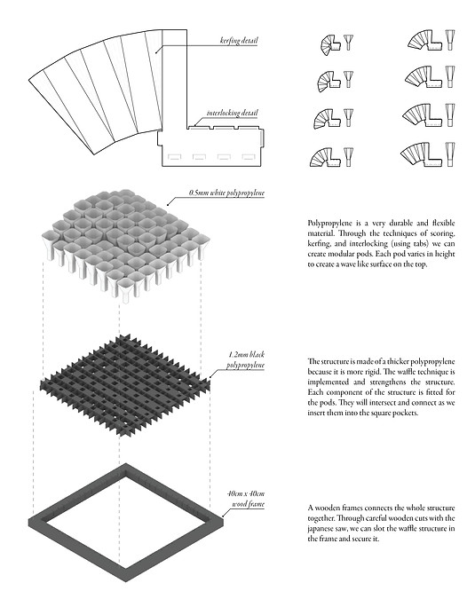 The project explores new fabrication techniques through the relation between the computer and the machine. Through the course, we design through the capabilities of three digital fabrication tools: laser cutter, CNC milling machine, and 3D printer. With these machines, our task is to develop modular components in various scales of architectural elements: a tile, a surface, and a panel.