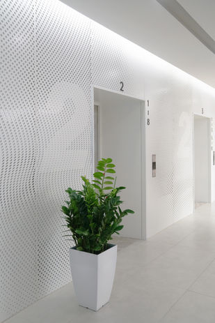 The façade is created with lasercut aluminum panels which are made offsite and assembled onsite. The perforations of the façade create a dynamic visual upon the existing building.